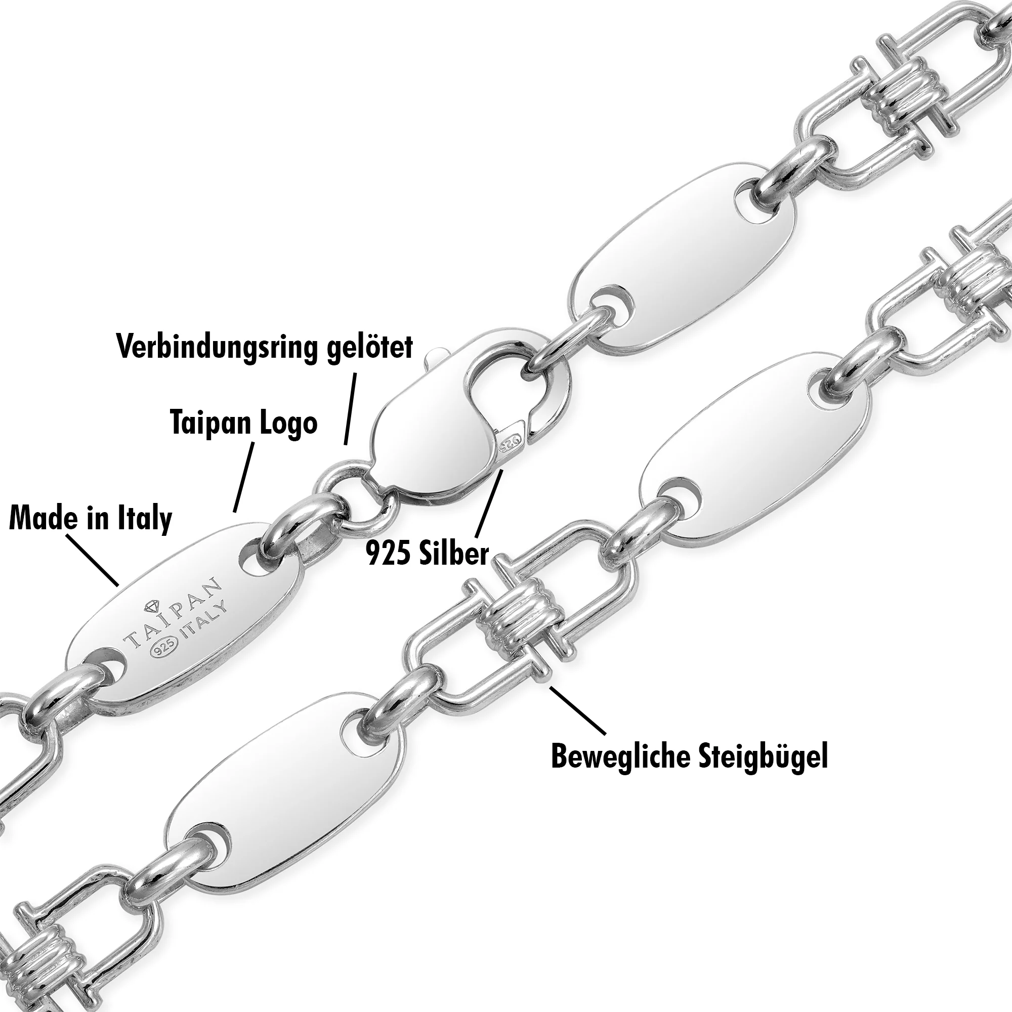 Jedes Glied der Plattenkette wurde mit höchster Präzision geschaffen, um eine raffinierte Ästhetik und gleichzeitig eine robuste Struktur zu gewährleisten. Das 925er Sterlingsilber verleiht der Kette nicht nur einen unvergleichlichen Glanz, sondern sorgt auch für eine langlebige Schönheit, die den Test der Zeit besteht.